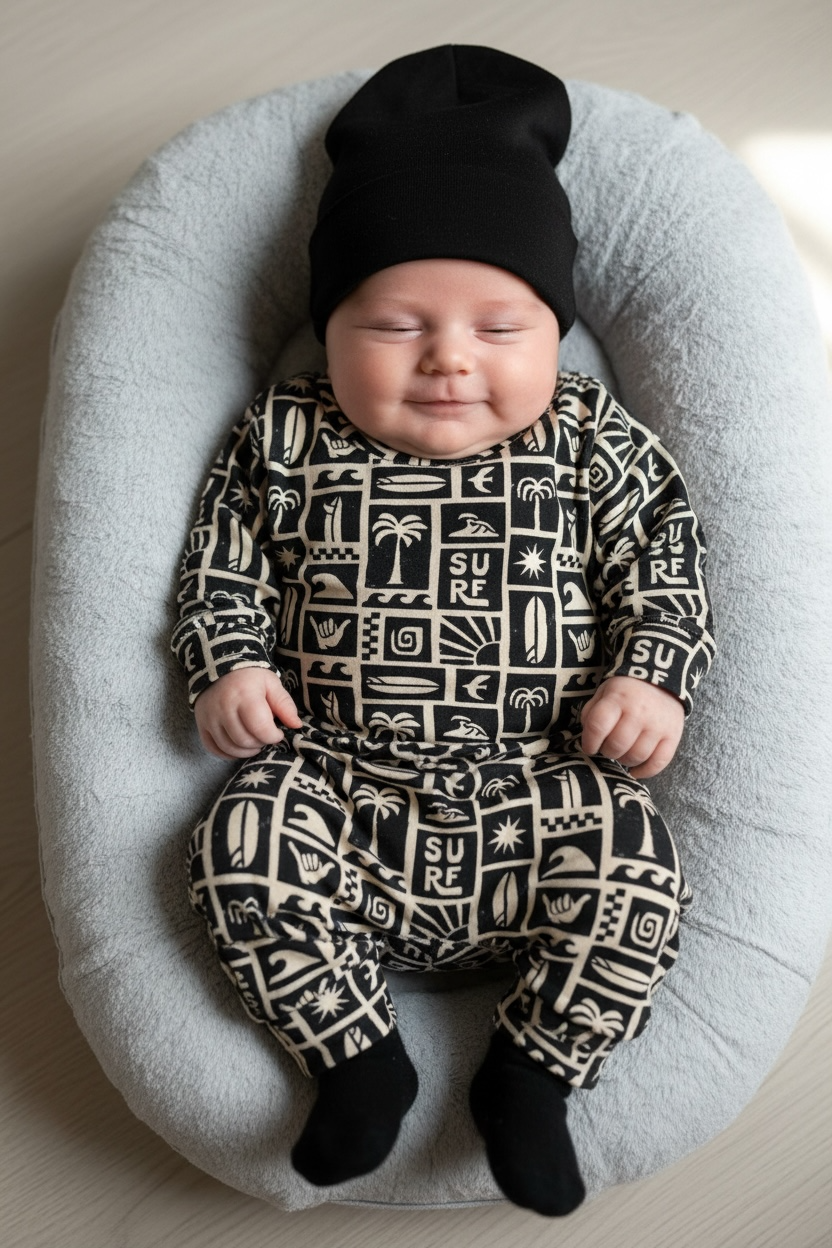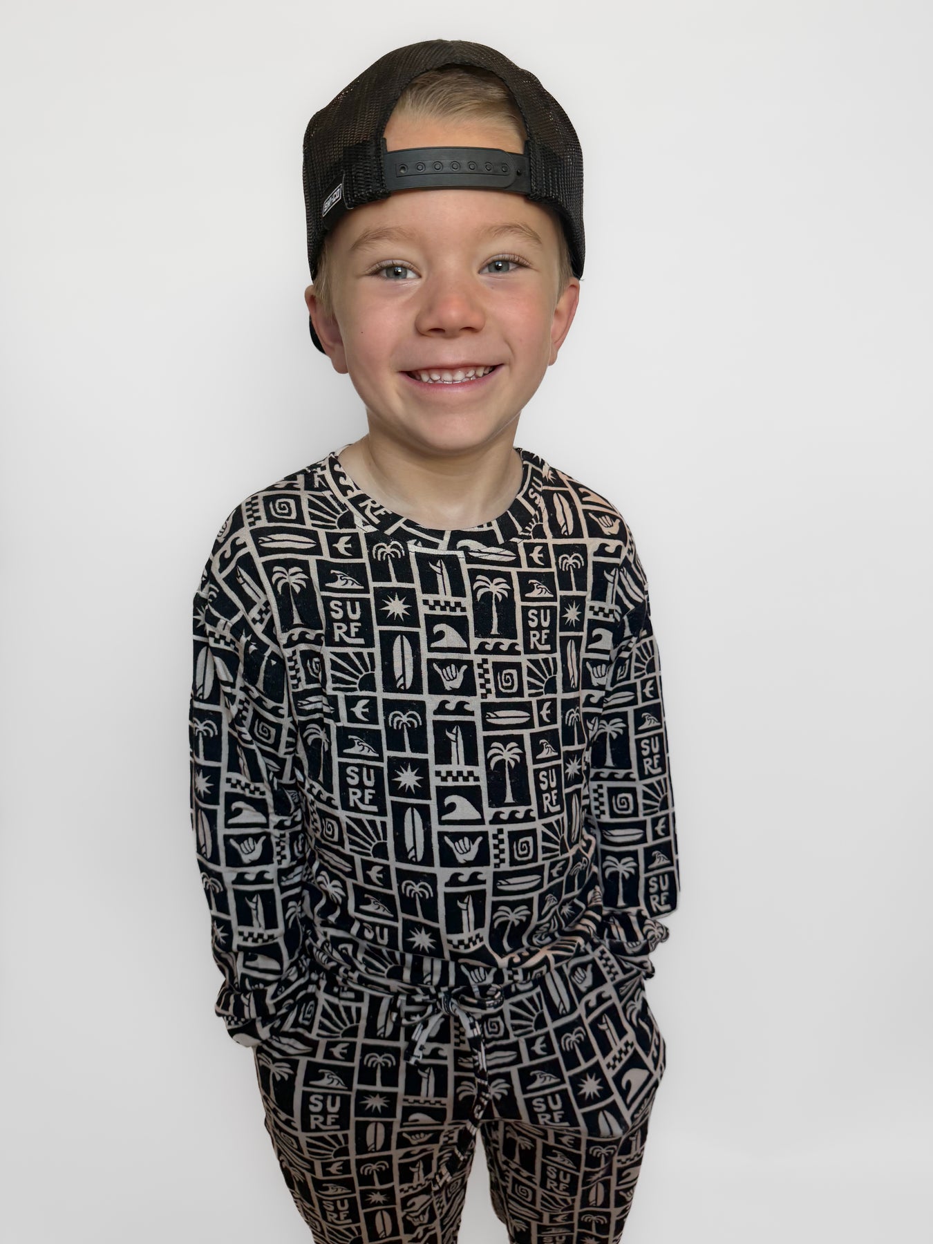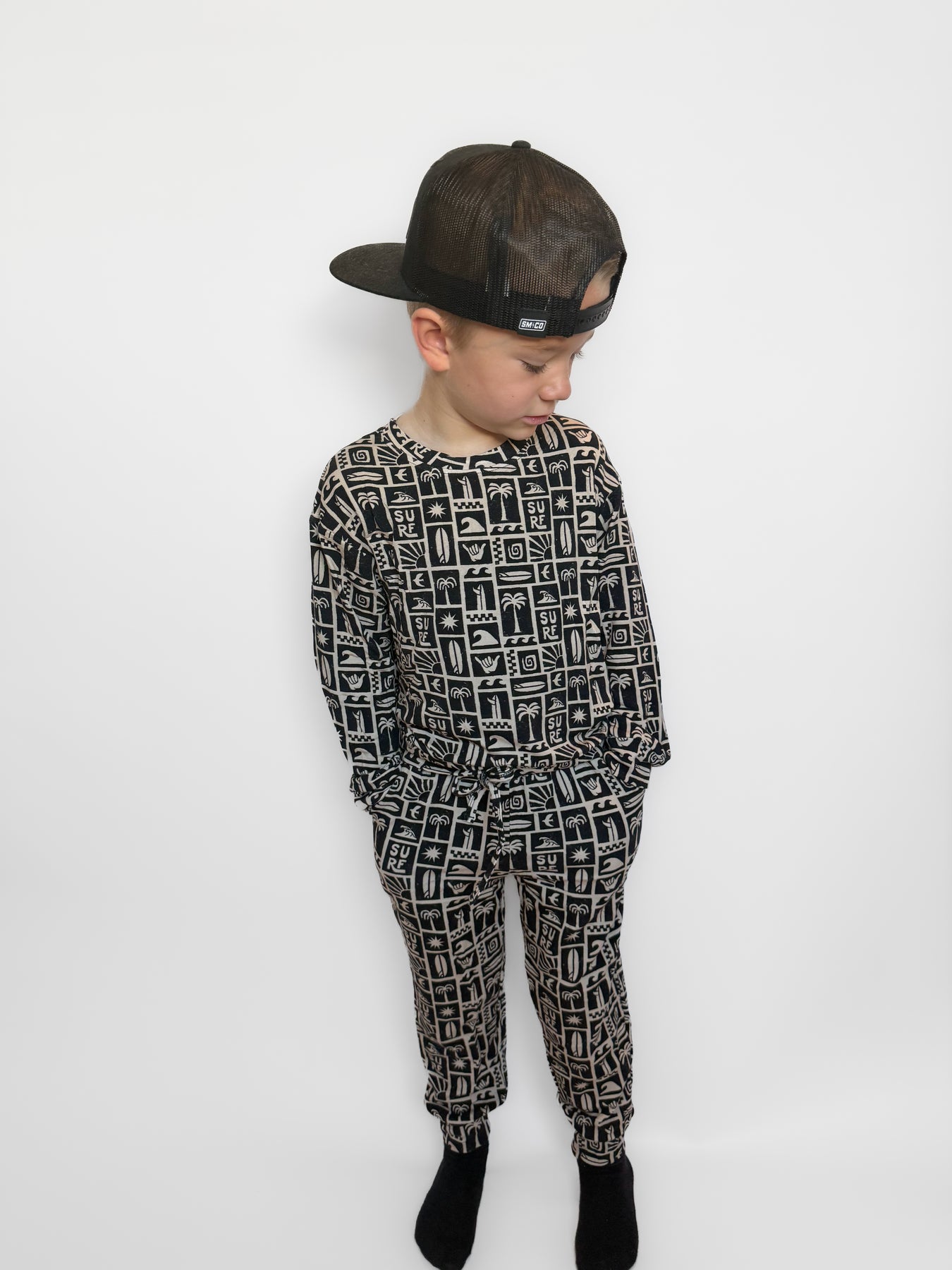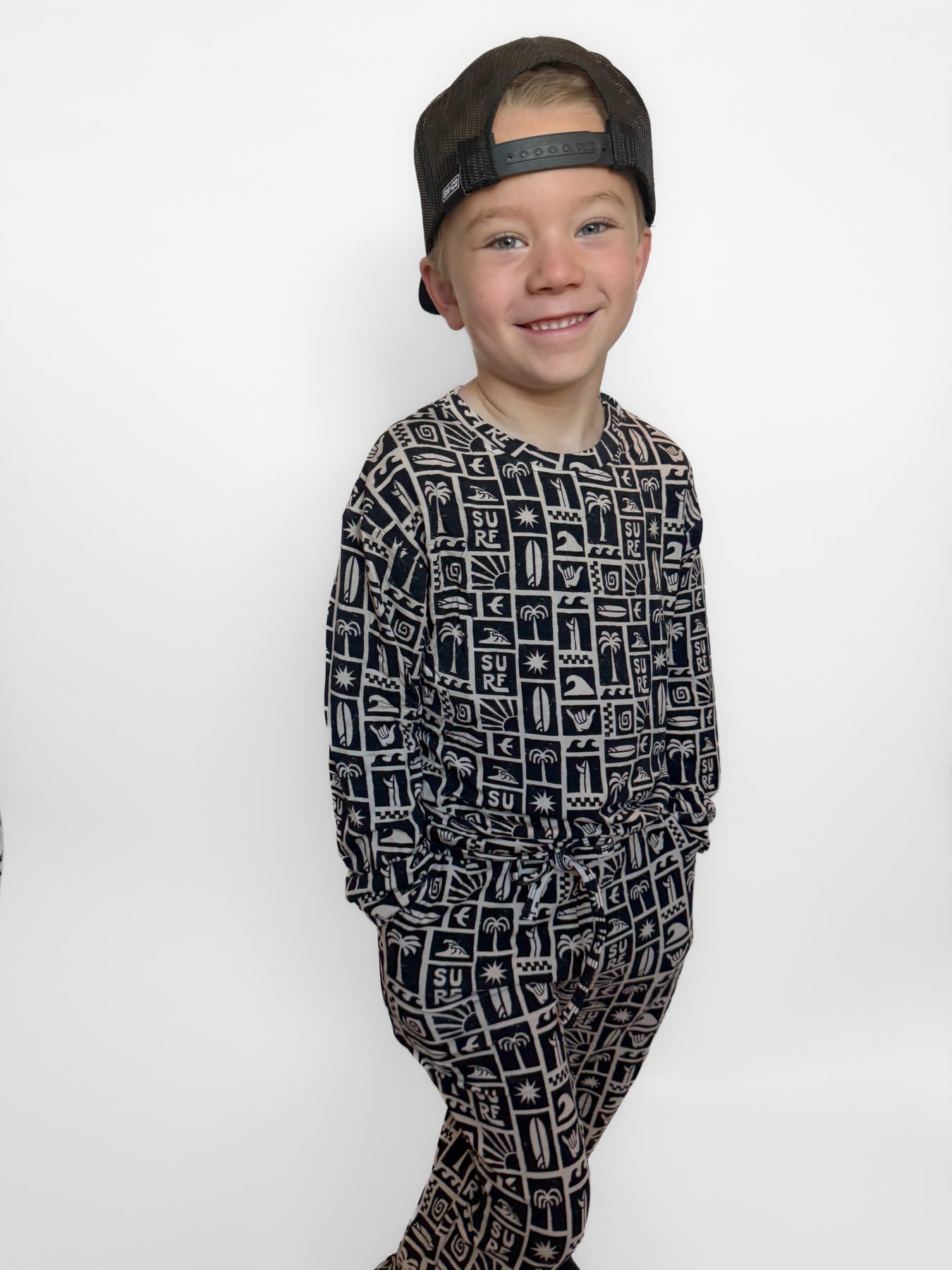 All the surfy vibes, wrapped up in the coziest bamboo set ever. Our Beach Break Bamboo Lounge Set is made for slow mornings, big play days, and comfy wind-down nights. Featuring our bold black + sand Beach Break print, this matching long sleeve + jogger set brings major beach energy—soft, stretchy, and ready for whatever the day brings.