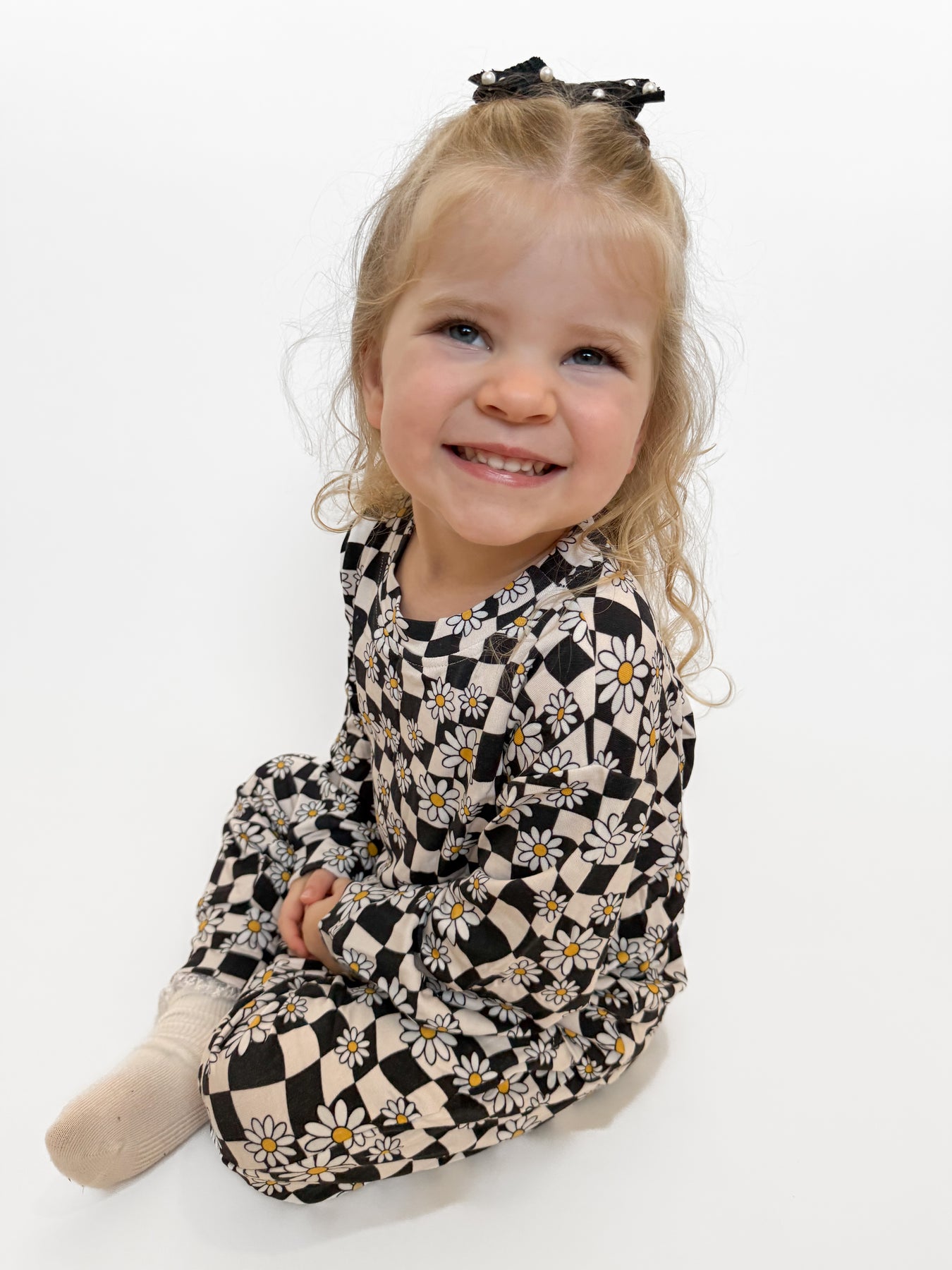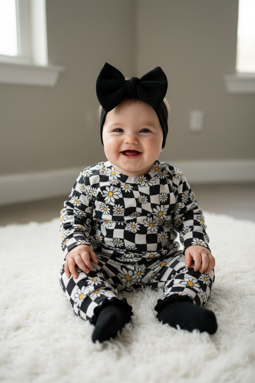 Sweet, playful, and made for all-day cozy. Our Daisy Bamboo Lounge Set features a fun black-and-cream check with sunny daisy blooms—perfect for kiddos who love to move, lounge, and live in comfort. This matching long sleeve top and jogger set is buttery soft, breathable, and stretchy in all the right ways.