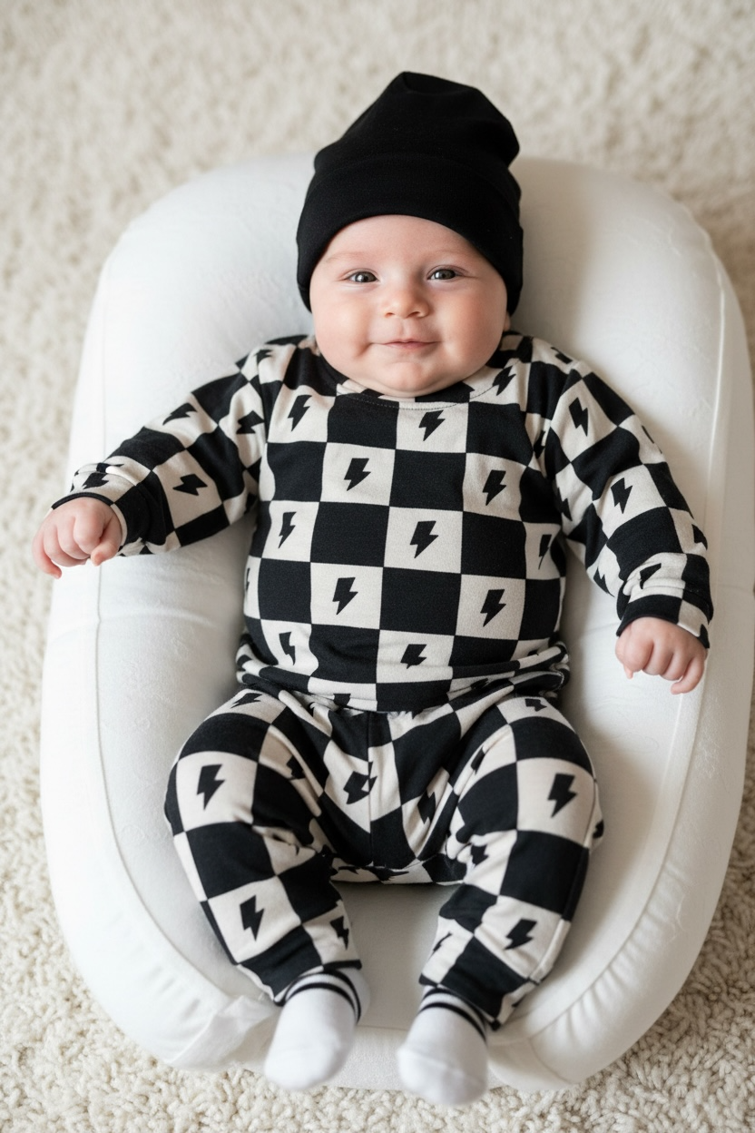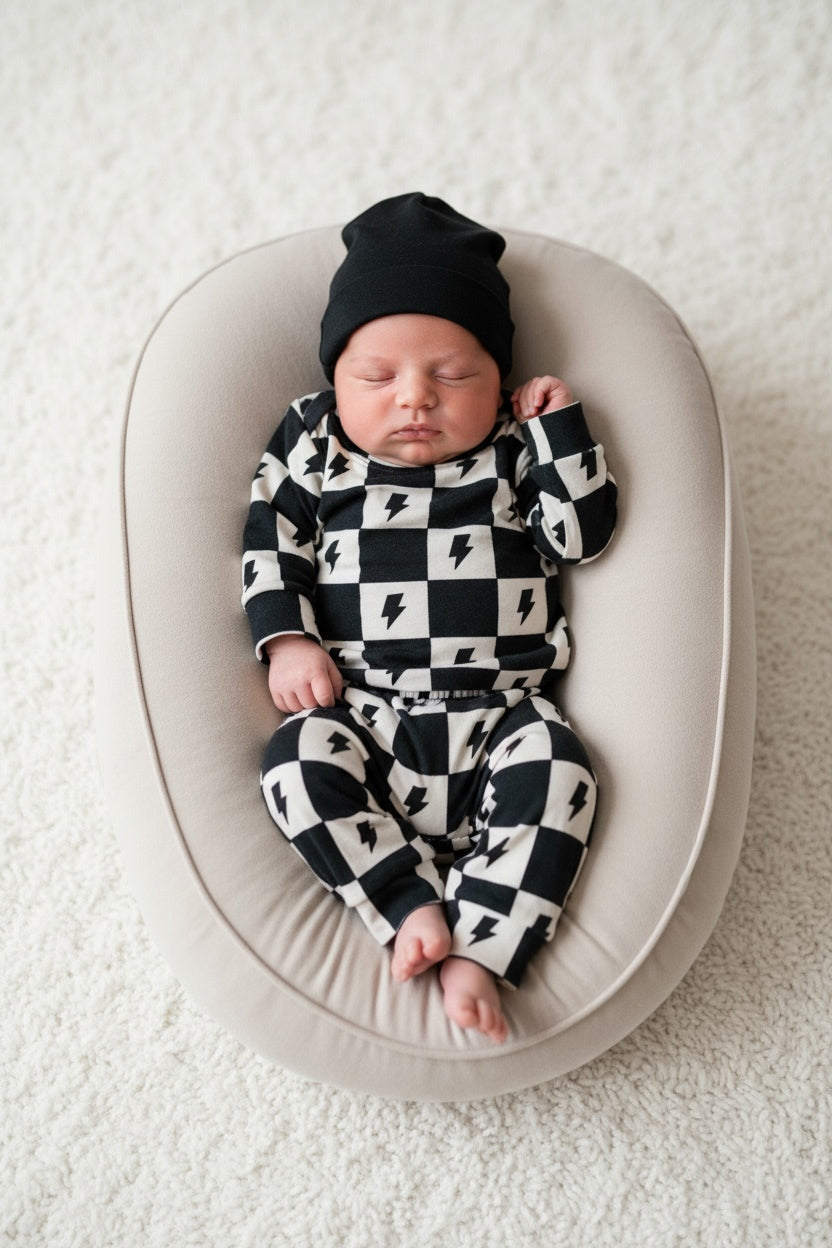 Comfy, cool, and made for nonstop kids. Our Vibe Check Bamboo Lounge Set brings major skate-meets-surf energy with a bold checker and lightning print, in an ultra-soft bamboo blend your little will live in.